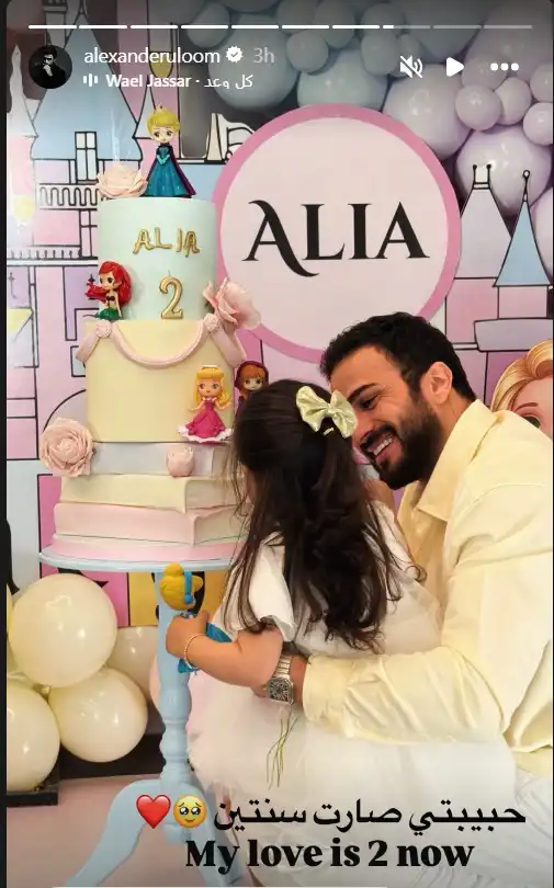 شارك ألكسندر علوم عبر حسابه على “إنستغرام” مقطع فيديو قصيرًا من الاحتفال، ظهر فيه يرقص على أنغام أغنية وائل جسار “كل وعد”، وكتب تعليقًا بسيطًا: حبيبتي صارت سنتين، ليعبّر عن سعادته الكبيرة بهذه اللحظة العائلية.