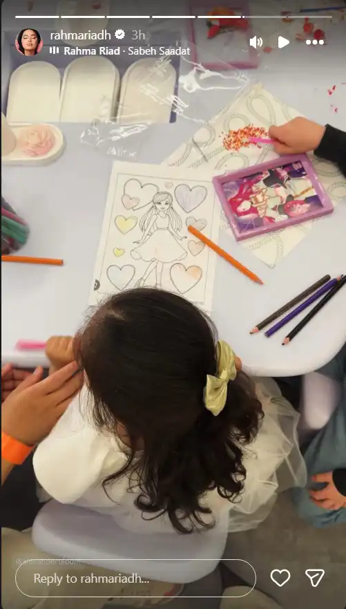 من جانبها، وثّقت رحمة رياض عدة لقطات من اليوم المميز عبر الستوري، أظهرت فيها عالية وهي تلوّن وترسم على الطاولة، في لقطة عفوية تبرز براءة الطفلة وحيويتها، فيما كان ألكس يشاركها الاحتفال بطريقة مرحة وطريفة.