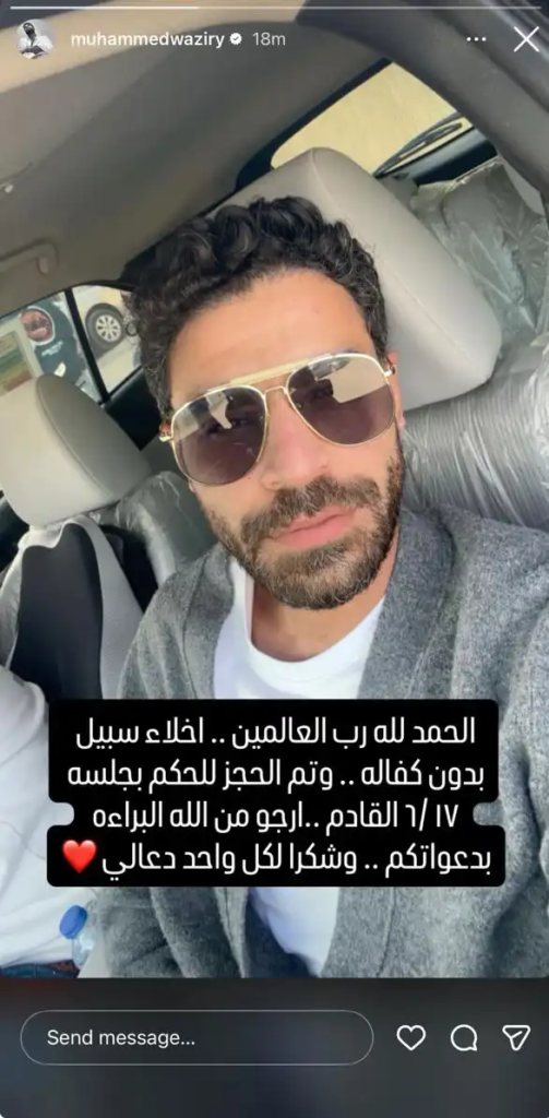 فور صدور القرار، أعرب محمد وزيري عبر حسابه في “إنستغرام” عن تفاؤله، كاتبًا: الحمد لله رب العالمين.. إخلاء سبيل من دون كفالة.. وتم الحجز للحكم بجلسة 17/6 القادم.. أرجو من الله البراءة بدعواتكم. وتعد هذه الرسالة هي الأولى لوزيري منذ فترة، ما يعكس رغبته في طي صفحة النزاع القضائي الطويل مع الفنانة اللبنانية.
