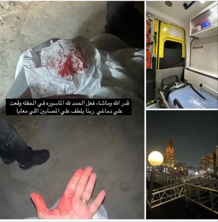 فقبل دقائق من صعود الفنان إلى المسرح، انهار هيكل معدني ضخم يحمل شاشات إضاءة وسقط على عدد من الجمهور، مما تسبب في إصابة ما لا يقل عن 15 شخصًا، وُصفت بعض الحالات بأنها خطيرة.