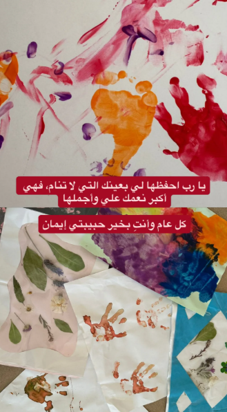 ونشر ولي العهد الأردني صورة عبر خاصية الستوريز على إنستغرام، تتضمن مجموعة من الرسومات الملونة، بما في ذلك طبعات قدمي الأميرة الصغيرة ويديها الصغيرتين وبعض أوراق الشجر.
