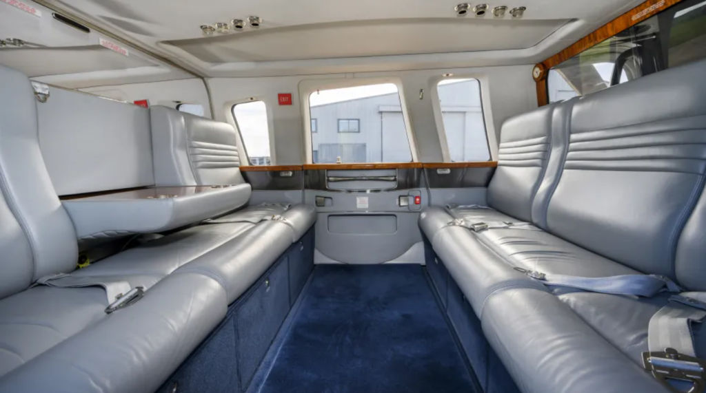 والمروحية المعروضة للبيع من طراز “سيكورسكي S-76C”، وتعود لعام 2009، وقد خدمت العائلة المالكة لأكثر من 15 عاماً. وتتميز بتصميم داخلي فاخر يشمل مقاعد جلدية رمادية، وسجادة زرقاء، وساعة خشبية، ونوافذ مظلّلة، ورفوفاً للمجلات.