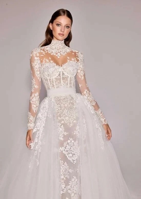 التصميم الكلاسيكي الممزوج بلمسات عصرية منح العروس إطلالة متوازنة ببراعة بين الرصانة والرقة، إذ تميّز بأكمام طويلة شفافة مطرّزة بالكامل بخيوط فضية ناعمة، أضافت لمسة فخامة دون أن تثقل الإطلالة، كما جاءت الياقة مرتفعة وشفافة من الدانتيل بأسلوب High-Neck، ما أضفى طابعاً أرستقراطياً يعكس الذوق الرفيع وشخصية ليلى الهادئة والرومانسية.