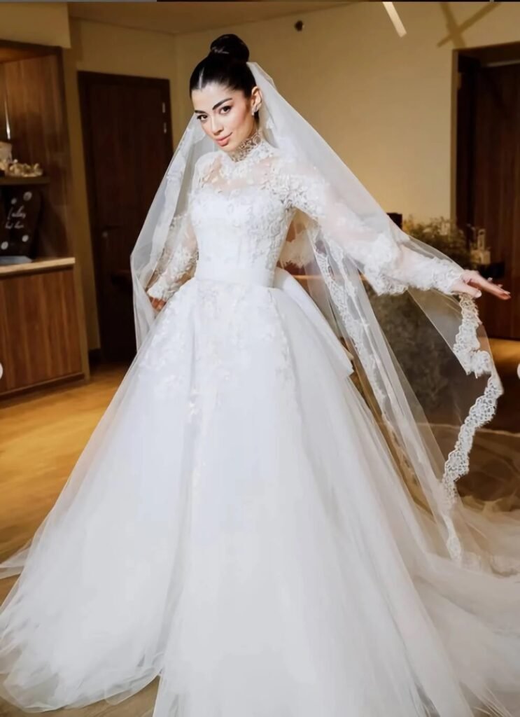 أما الصدر والظهر فكانا مكشوفين جزئيًا بطريقة أنيقة وراقية تمنح التوازن المثالي بين الجرأة والأنوثة، في حين انساب الذيل الطويل للفستان على الأرض بخفة وجمال، مضيفًا حضورًا ملكيًا لا يُنسى. ولم تكتمل هذه الصورة الحالمة إلا بالطرحة الطويلة المصنوعة من التول الناعم الشفاف، التي انسجمت بتناغم تام مع التصميم دون أن تطغى عليه، بل زادت من الطابع الرومانسي لإطلالة أشبه بلوحة فنية متكاملة.