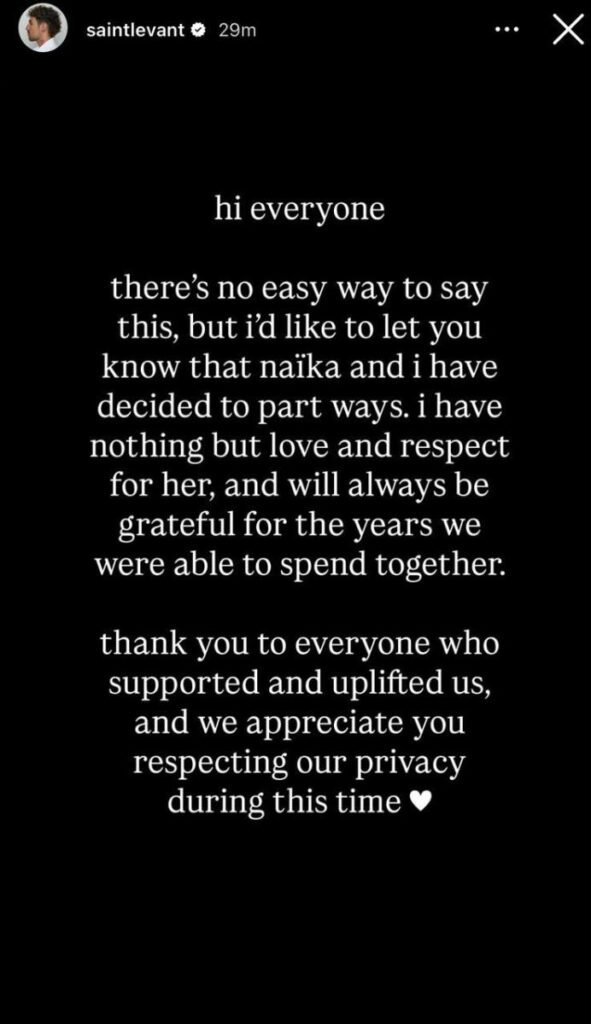 وكتب ليفانت: مرحبًا، لا توجد طريقة سهلة لقول هذا، لكنني أريد أن أخبركم أنني ونايكا قررنا الانفصال. لا أملك لها سوى الحب والاحترام، وسأظل دائمًا ممتنًا للسنوات التي قضيناها معًا. شكرًا لكل من دعمنا وشجعنا، ونقدّر احترامكم لخصوصيتنا في هذا الوقت.