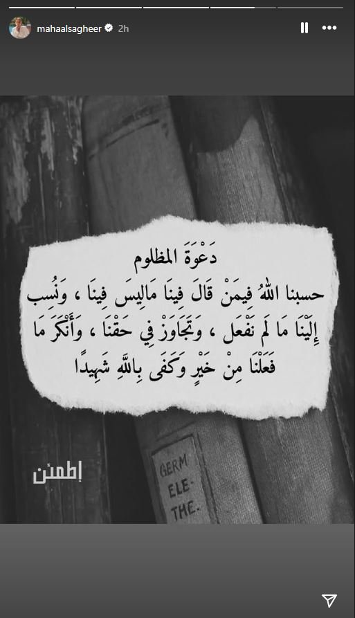 وفي ستوري أخرى، قالت: “دعوة المظلوم، حسبنا الله فيمن قال فينا ما ليس فينا، ونُسب الينا ما لم نفعل، وتجاوز في حقنا، وانكر ما فعلنا من خير وكفى بالله شهيدا”.