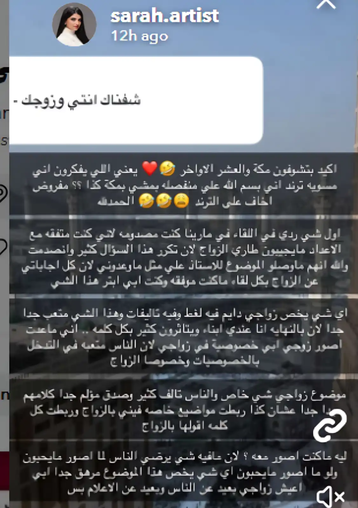 وفي المقابل، خرجت سارة بسلسلة من المنشورات أوضحت فيها حقيقة وضعها، مؤكدة استمرار علاقتها بزوجها، ونافيةً بشكل قاطع الشائعات المتداولة، مشيرة إلى أنها لم تسعَ يومًا لتصدر الترند بمثل هذه الأخبار.