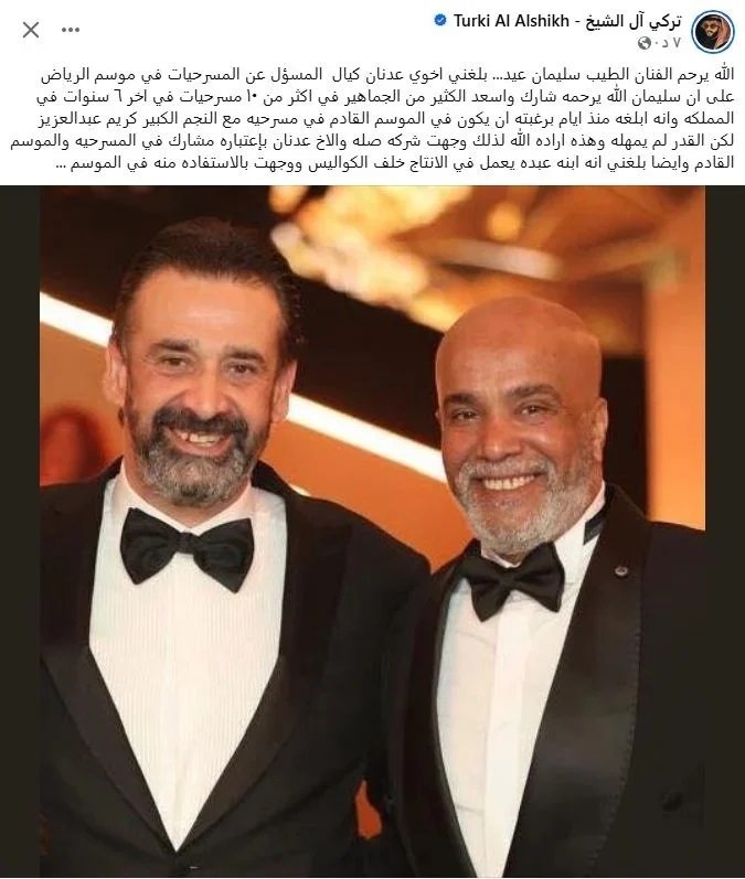 وقال آل الشيخ: “الله يرحم الفنان الطيب سليمان عيد… بلّغني أخوي عدنان كيال المسؤول عن المسرحيات في “موسم الرياض” أن سليمان الله يرحمه شارك وأسعد الكثير من الجماهير في أكثر من 10 مسرحيات في آخر 6 سنوات في المملكة، وأنه أبلغه منذ أيام برغبته بأن يكون في الموسم المقبل في مسرحية مع النجم الكبير كريم عبدالعزيز، لكن القدر لم يمهله، وهذه إرادة الله”.