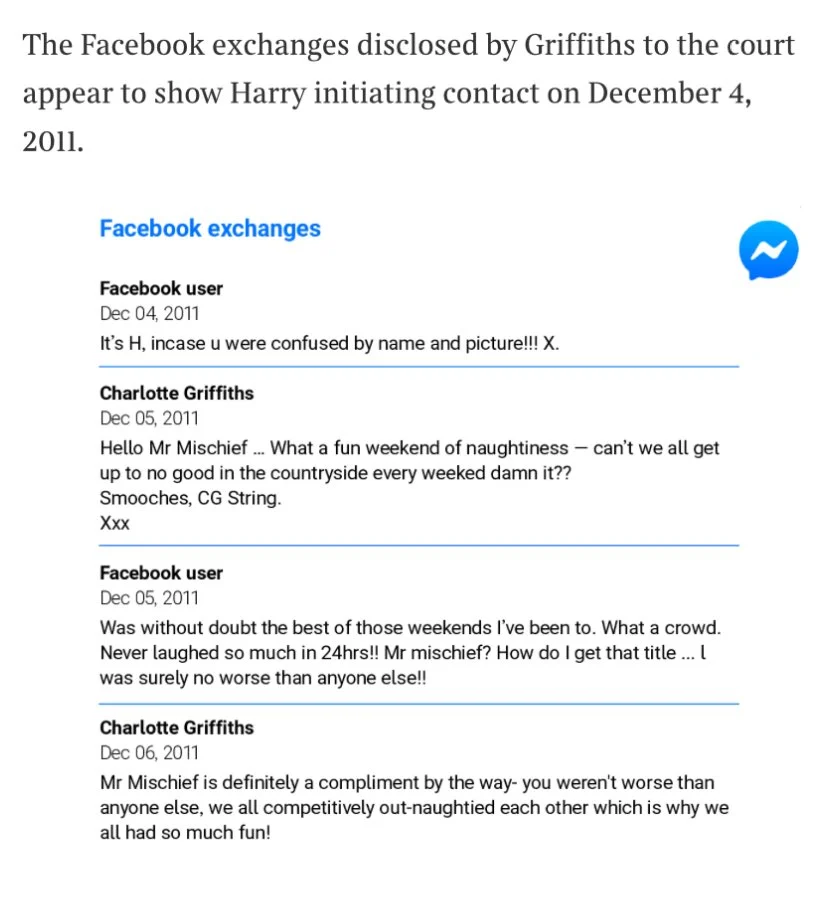 أظهرت وثائق قضائية أن الأمير هاري أرسل رسائل غزلية صريحة عبر “فيسبوك” إلى مراسلة صحيفة “ديلي ميل”.
