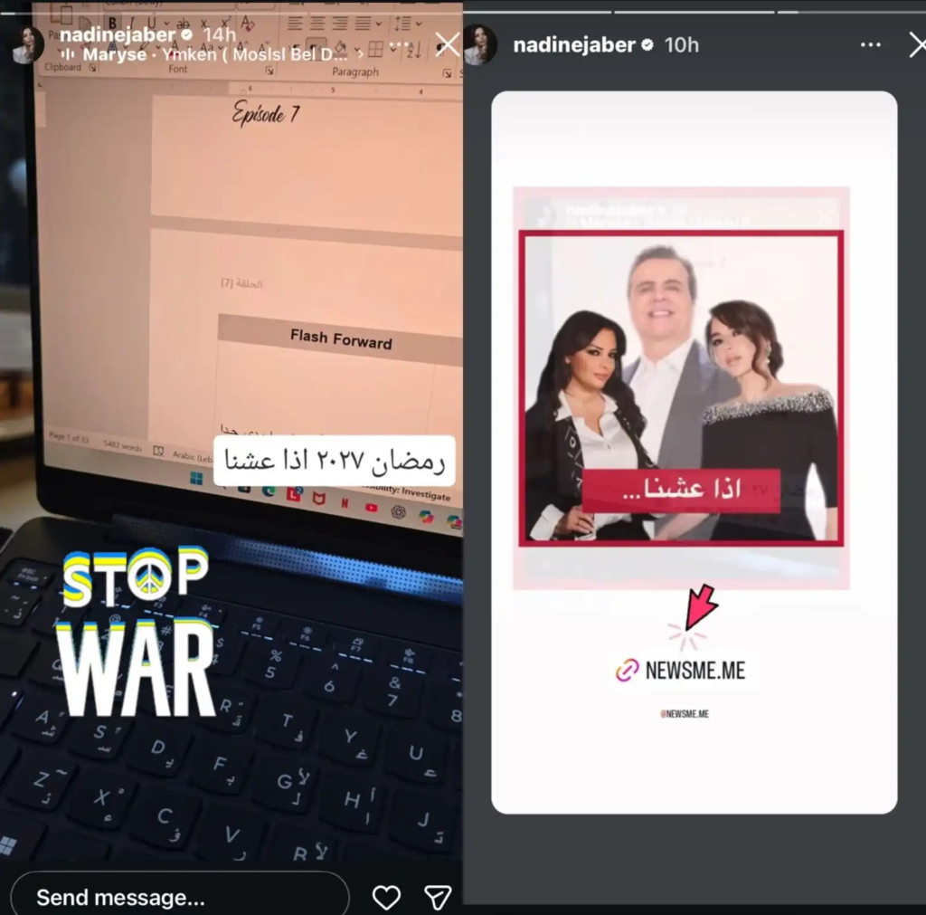 وفي “ستوري” أخرى، كشفت ندين جابر أن بطولة العمل ستعود إلى النجمة اللبنانية ماغي بوغصن، في تعاون جديد يجمعهما بعد النجاح الذي حققتاه في “بالدم” و”للموت”.