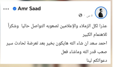 ونشر الفنان عمرو سعد، عبر صفحته الرسمية في منصة “فيسبوك”، قائلاً: عذرًا لكل الزملاء والإعلاميين لصعوبة التواصل حاليا وشكراً للاهتمام الكبير. أحمد سعد إن شاء الله هايكون بخير بعد تعرضة لحادث سير صعب قدر الله وماشاء فعل.. دعواتكم لينا.