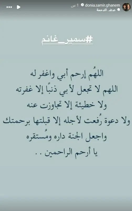 وطلبت دنيا في رسالتها من جمهورها الدعاء لوالدها في ذكرى وفاته الرابعة، وكتبت قائلةً: “اللّهم ارحم أبي، واغفر له، اللّهم لا تجعل لأبي ذنباً إلا غفرته، ولا خطيئة إلا تجاوزت عنها، ولا دعوة رُفعت لأجله إلا قبلتها برحمتك، واجعل الجنّة داره ومستقرّه، يا أرحم الراحمين”.