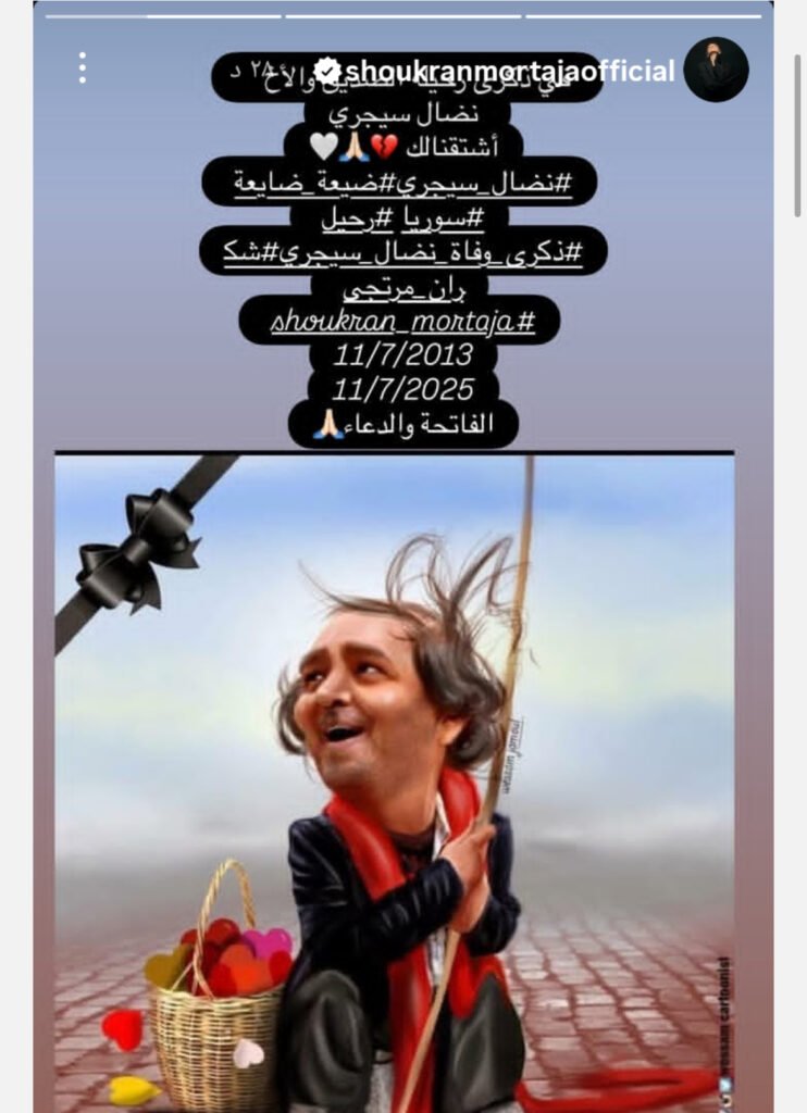 وأرفقتها مرتجى الصورة بتعليق مؤثر قالت فيه: في ذكرى رحيل الصديق والأخ نضال سيجري، اشتقنالك.. 11/7/2013-11/7/2025، الفاتحة والدعاء.