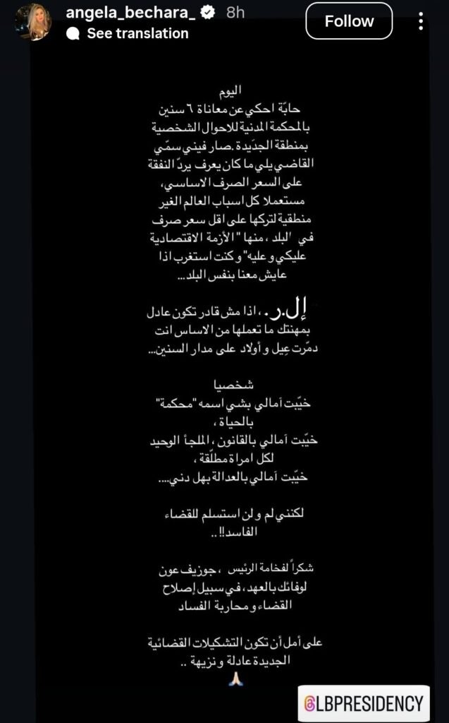 وبدأت أنجيلا رسالتها “انا اليوم بدي احكي عن معاناة 6 سنوات بالمحكمة المدنية للأحوال الشخصية، صار فيني سمي القاضي يلي ما كان يعرف يرد النفقة على أساس سعر الصرف الأساسي”، متهمةً إياه باستخدام “مبررات وكل أسباب العالم غير منطقية لترك النفقة على أقل سعر صرف في البلد، منها الازمة الاقتصادية عليكي وعليه، وكنت استغرب اذا هو عايش معنا بنفس البلد!!”.