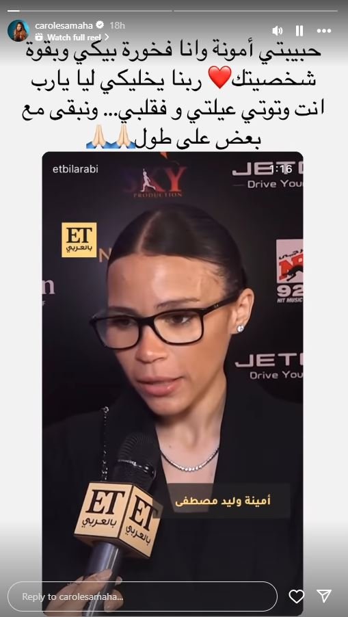 من جهتها، شاركت الفنانة اللبنانية كارول سماحة فيديو المقابلة عبر خاصية القصص القصيرة على حسابها عبر انستغرام، وارفقته بالتعليق التالي: “حبيبتي امونة وانا فخورة فيكي وبقوة شخصيتك.. ربنا يخليكي ليا يا رب انتي وتوتي عيلتي وفقلبي.. ونبقى مع بعض على طول”.