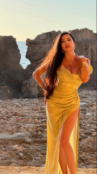 في إطلالة ساحرة، ارتدت لاميتا فستاناً ساحراً بلون ذهبي متلألئ، مستوحاة من قماشة “اللاميه” الإيطالي الأكثر رواجاً هذا الصيف، وجاء الفستان من دون كُمّيْن، ويتميز التصميم بياقة مكشوفة الكتفين وكسرات أنيقة تلتف برشاقة حول الجسم. يضيف الشق الجانبي العالي بقصّة مكشوفة من جانب اليمين لتنورة الفستان لمسة جريئة وجذابة، بينما تبرز القصة الانسيابية جمال القوام، أقرنته مع نظّارات شمسيّة ذات إطار أسود.