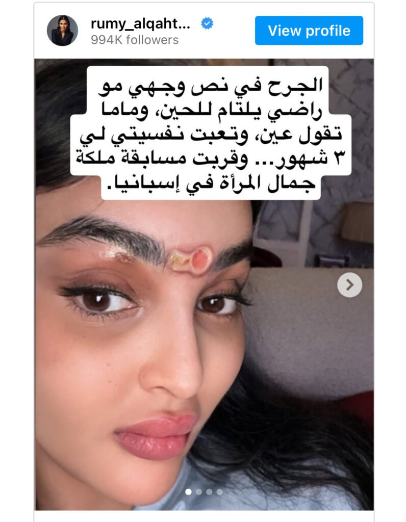 صدمت ملكة جمال السعودية رومي القحطاني متابعيها على شبكات التواصل الإجتماعي بالإعلان عن تعرّضها لإصابة بليغة في وجهها، قد تحرمها من المشاركة في مسابقة “ملكة جمال المرأة العالمية”، التي تُقام في مدينة تينيريفي الإسبانية خلال شهر أيلول (سبتمبر) المقبل.