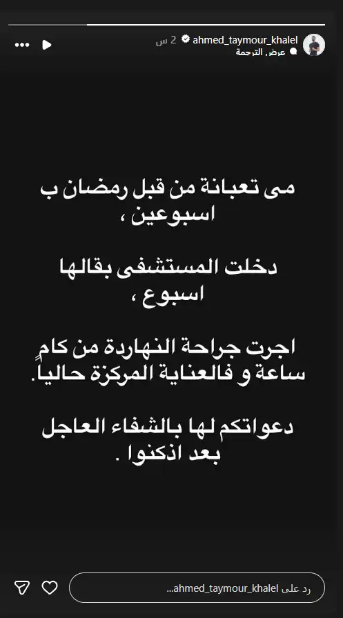 كتب أحمد تيمور عبر حسابه على إنستغرام: مي تعبانة من قبل رمضان بأسبوعين، دخلت المستشفى بقالها أسبوع، أجرت جراحة النهارده من كام ساعة وفي العناية المركزة حاليًا، دعواتكم لها بالشفاء العاجل بعد إذنكم، في رسالة أثارت قلق جمهور مي عز الدين وتصدرت تفاعلات مواقع التواصل الاجتماعي.